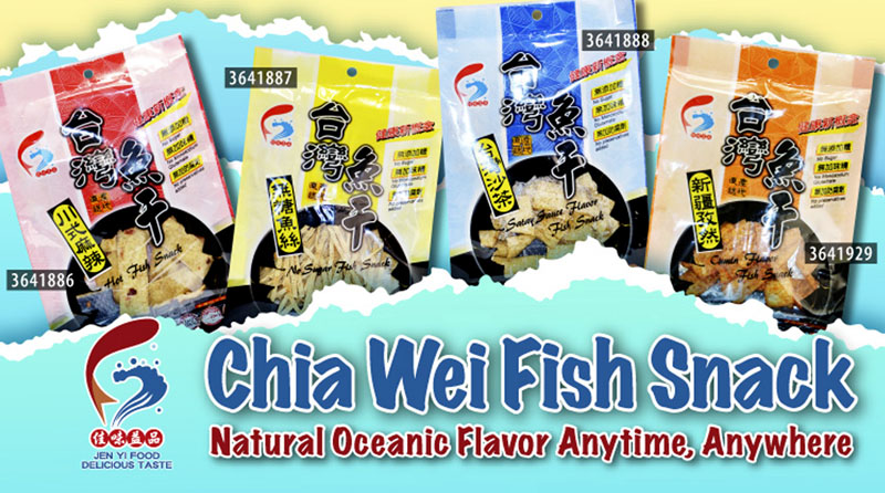 With HACCP, ISO22000 and Islamic HALAL certification, Chia Wei Fish Snacks, manufactured by Jen Yi Foods Co., are made from the freshest ingredients and unique seasoning formula after slow roasting. No deep-fry and oily smell. No sugar, MSG and preservatives included. Quality, crispy texture with fresh and sweet taste is ideal to snack with tea, beer or serve at social gatherings. From Sichuan spicy flavor: Chia Wei Fish Snack Hot (3641886); elaborately grilled fish for fresh taste: Chia Wei Fish Snack No Sugar (3641887); Taiwanese traditional flavor: Chia Wei Fish Snack Satay Sauce (3641888) to powerful aroma and flavor of Xinjiang spice: Chia Wei Fish Snack Cumin (3641929). Stocking Chia Wei Fish Snacks can expand your selections and fulfill shoppers who are nutritional, healthy and wellness oriented.